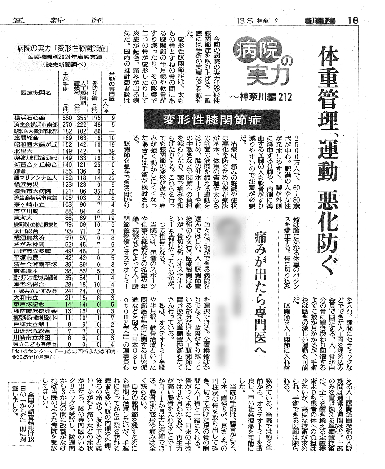 2026年1月25日発行の読売新聞 “病院の実力~神奈川編“【変形性膝関節症】に
