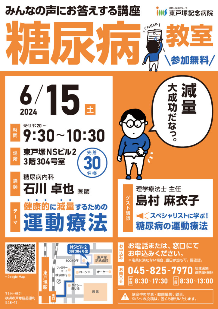 次回開催の糖尿病教室(2024年6月) 2024年4月26日 最終更新日時 : 2024年5月7日 東戸塚記念病院 広報企画室 『健康的に減量するための運動療法』 糖尿病内科 石川卓也 医師 2024年6月15日(土)9:30~(受付9:20~) 東戸塚NSビル・2 304号室(3階) お申込みはこちら:TEL 045-825-7970(地域医療連携室)