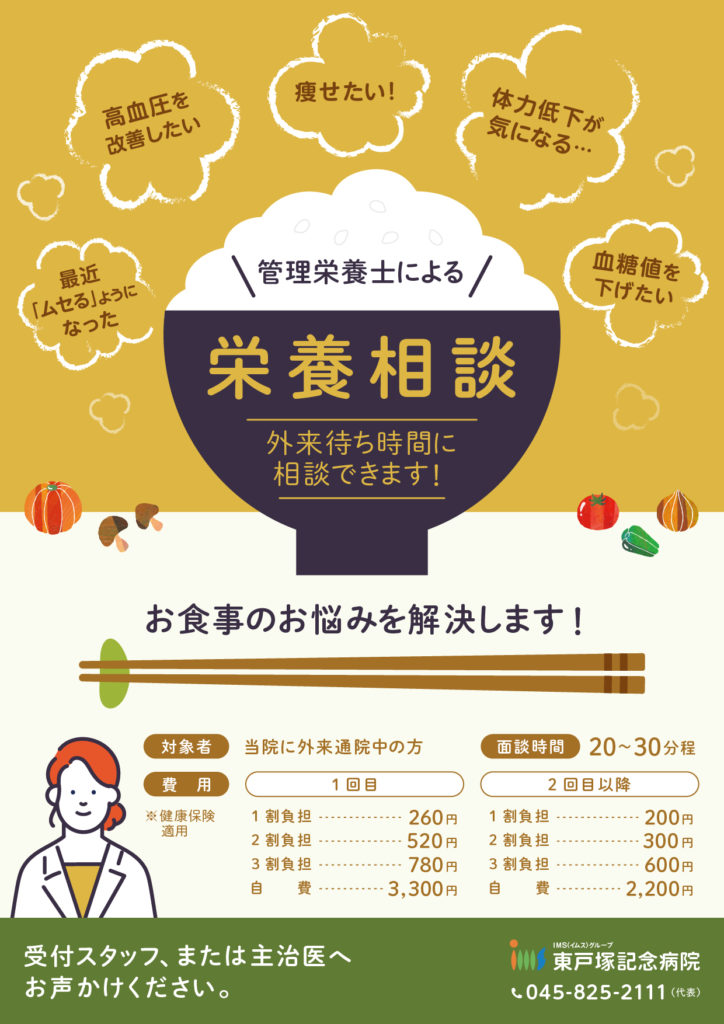 栄養管理士による「栄養相談」のご案内をリニューアルしました。当院に外来通院中の方、外来待ち時間に相談できます!