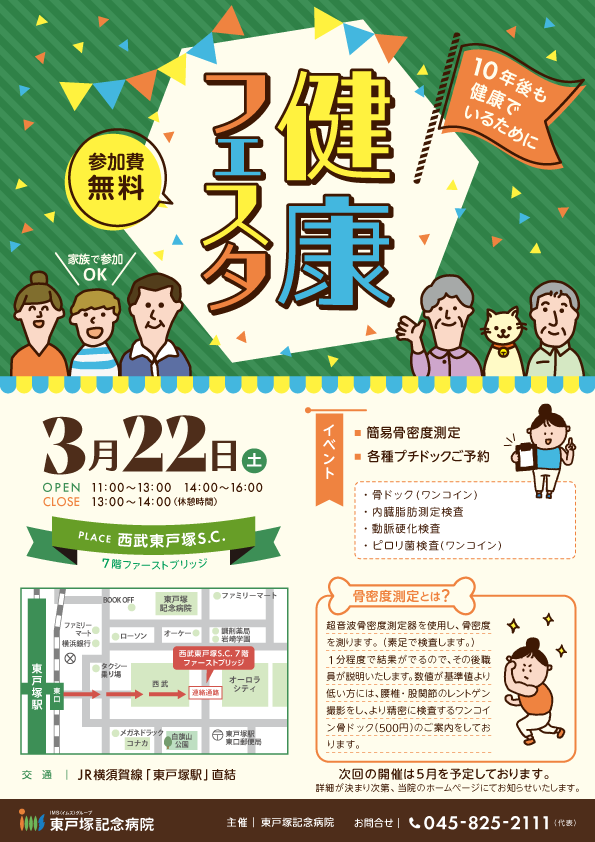 3月 健康フェスタ開催のお知らせ 2025年3月12日 最終更新日時 : 2025年3月12日 東戸塚記念病院 広報企画室 3月22日(土)西武東戸塚S.C7階ファーストブリッジにて『健康フェスタ』を開催いたします! 簡易骨密度測定を実施いたします。この機会にぜひご自身の骨密度を測定し、骨の健康状態を確認していただければと思います。 ご参加、心よりお待ちしております! 詳細はこちら 西武東戸塚S.C 7階 フロアマップはこちら