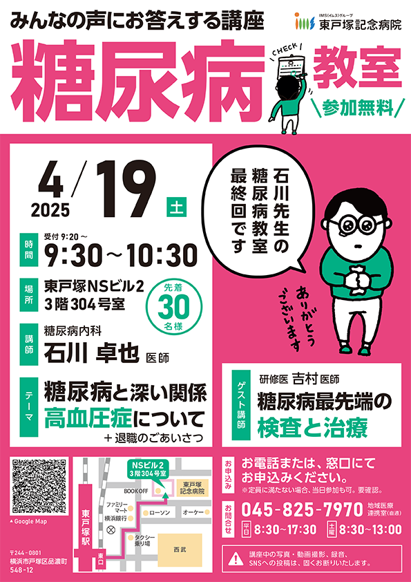 4月19日(土)に開催予定の糖尿病教室の予約が始まりました。